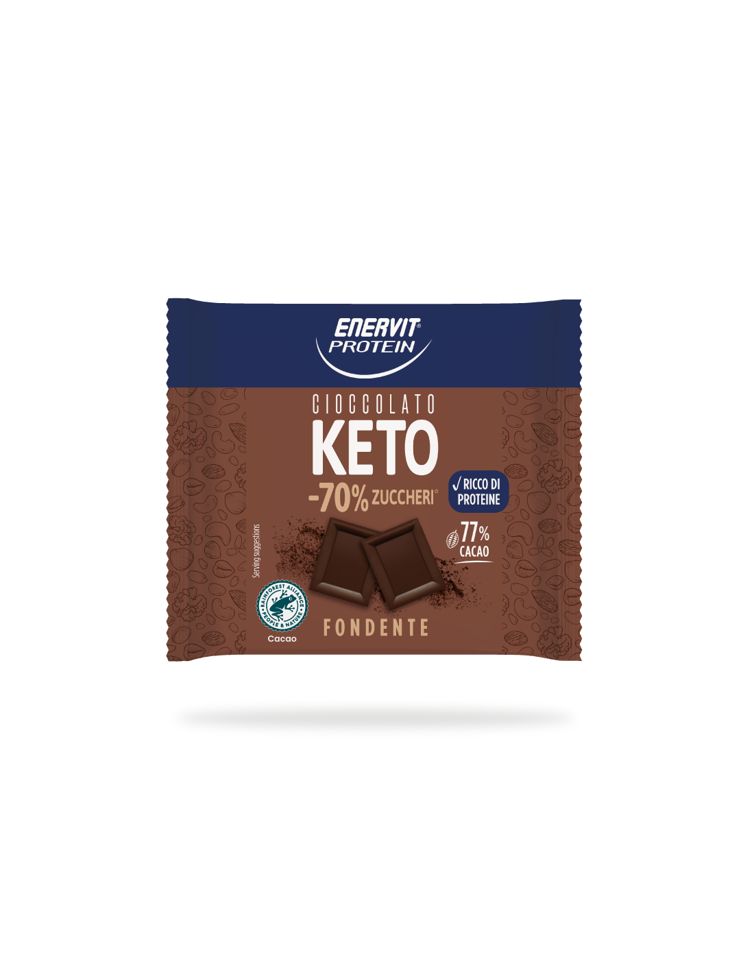 La tavoletta proteica di cioccolato fondente Cioccolato Keto è ricca in proteine del latte, con ingredienti di primissima qualità, come il cacao certificato Rainforest Alliance, presente al 77%, che conferisce un gusto intenso e deciso ad ogni quadratino.