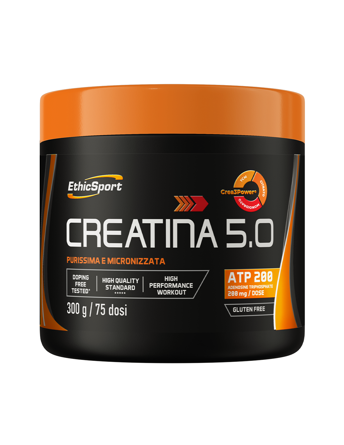 Creatina 5.0 è un integratore innovativo di creatina con Crea3Power e ATP, due elementi essenziali per il supporto energetico cellulare, ideale per atleti che cercano performance avanzate. Crea3Power offre all’organismo tre diverse forme biodisponibili di creatina per la migliore performance. La creatina è nota per migliorare le prestazioni fisiche in sforzi brevi e intensi. ATP è fondamentale per la produzione energetica cellulare, supporta il corpo nelle fasi di alta intensità, aiutando l’efficienza energetica intracellulare. Creatina 5.0, formula esclusiva della ricerca EthicSport, è altamente purificata, micronizzata (200mesh) e formulata per un'assimilazione ottimale. L’alta qualità è garantita dalla certificazione microbiologica e doping free tested.