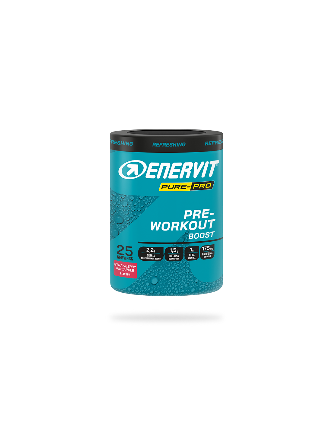 Se il tuo obiettivo è quello di un continuo miglioramento, attraverso workout sempre più impegnativi, PURE-PRO Pre Workout è quello che fa per te. Mezz’ora prima di allenarti prepara il tuo shake versando il contenuto di un misurino in acqua e goditi la tua bevanda rinfrescante al gusto fragola e ananas.