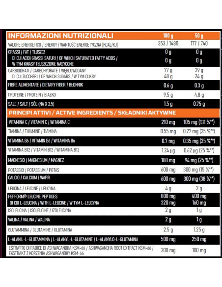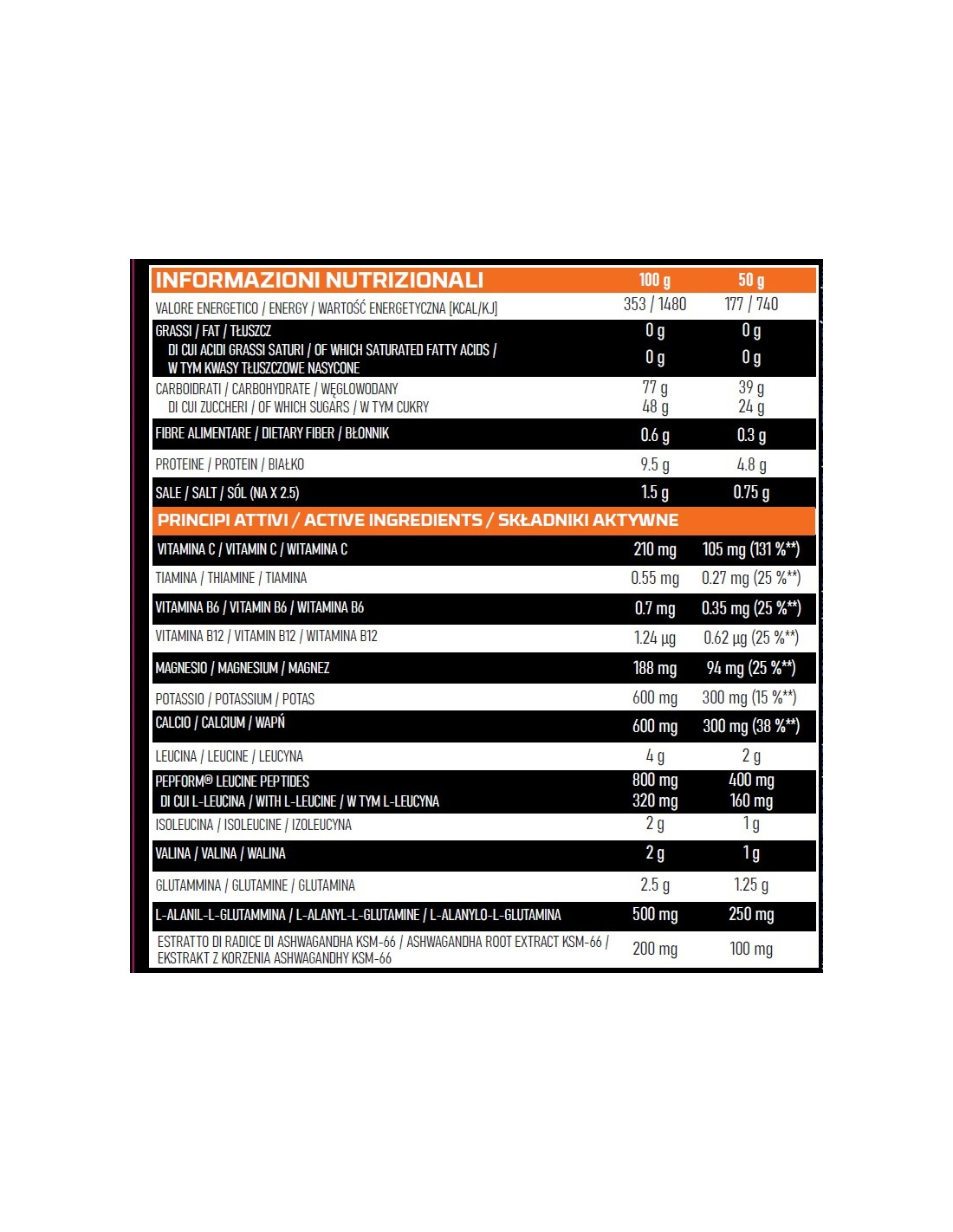 Complesso di carboidrati (saccarosio, glucosio, maltodestrina de6) 72%, Aminoacidi a catena ramificata Bcaa (l-leucina, l-valina, l-isoleucina, emulsionante: lecitine), correttore di acidità: Acido malico; l-glutammina, aromi, citrato di potassio, carbonato di calcio, sali di magnesio dell'acido citrico (magnesio), bicarbonato di sodio, pepform leucine® (proteine del siero di latte idrolizzate da latte, l-leucina) 40% della l-leucina totale, tricitrato di sodio, l-alanil-l-glutammina, antiagglomerante: biossido di silicio; Acido-l-ascorbico (vitamina c), estratto di radice di Ashwagandha (withania somnifera l. Dunal) - Ksm-66 Ashwagandha® standardizzato al 5% di withanolidi, succo di barbabietola concentrato in polvere, colorante: Caroteni; piridossina idrossido (Vitamina B6), tiamina cloridrato (Vitamina B1), metilocobalamina (Vitamina B12).