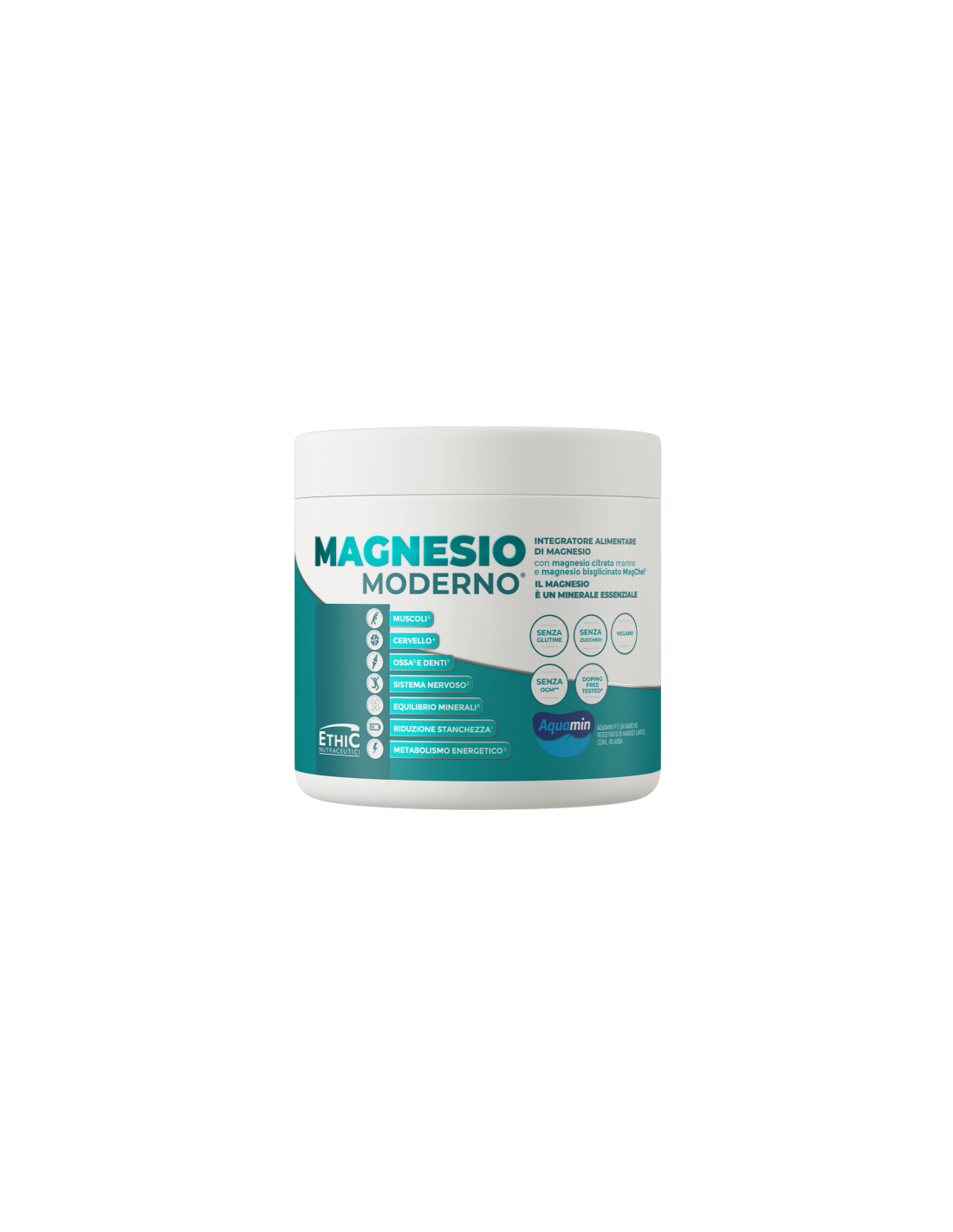 Magnesio Moderno è una la formula innovativa che combina magnesio citrato marino (AQUAMIN®) e magnesio chelato (MagChel®), per ottenere tanti benefici in un solo prodotto: il magnesio è così efficace e biodisponibile.
